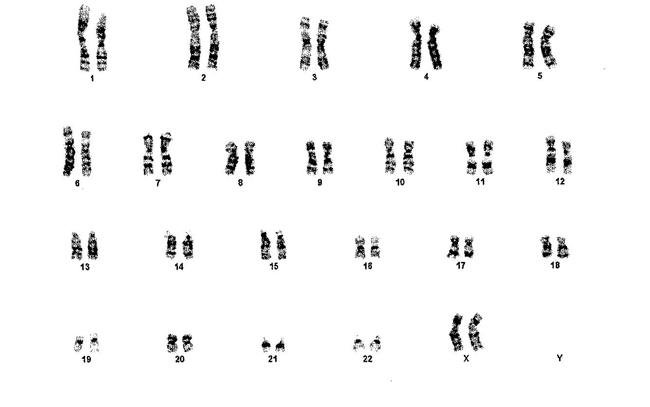 Los cromosomas se pueden identificar fácilmente en un análisis de sangre. Es lo que llamamos cariotipo. Un resultado normal es el de 46 XY en el hombre y 46 XX en la mujer. En los cromosomas se pueden distinguir dos brazos (uno corto y otro largo):